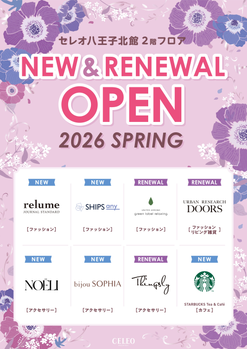 今回のリニューアルでは、旬のスタイルを取り入れたファッションのセレクトショップや、ゆったりくつろげるカフェ等、セレオ八王子初出店となる5店舗を含む計8店舗が装い新たにオープン、併せて2階エントランス・吹き抜けの環境も一新します。