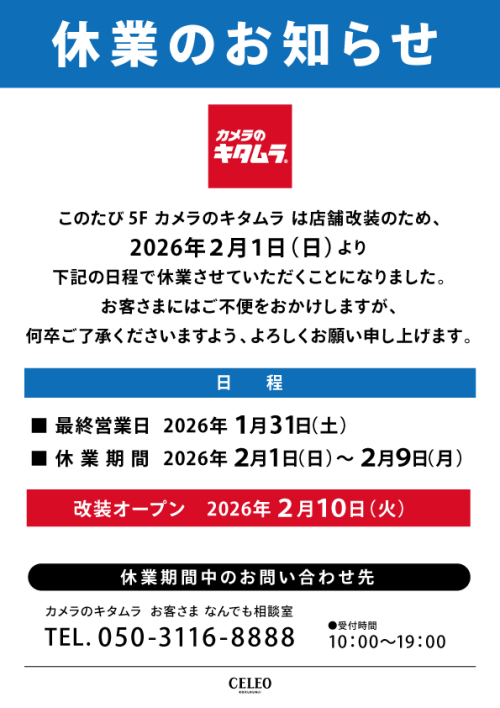 5Fカメラのキタムラは店舗改装のため、下記期間休業いたします。 2026年2月1日(日)~2月9日(月) お客様にはご不便をおかけいたしますが、何卒ご了承くださいますよう、お願い申し上げます。 詳細はポスターをご確認ください。