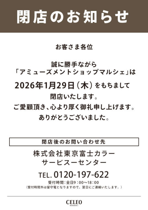 誠に勝手ながら「5F_アミューズメントショップマルシェ」は2026年1月29日(木)をもちまして閉店いたします。
