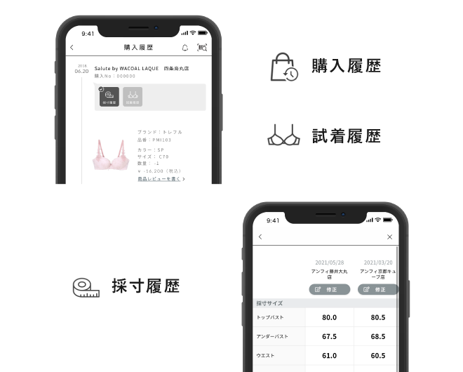 購入、試着、採寸履歴をアプリ内に残すことができます。