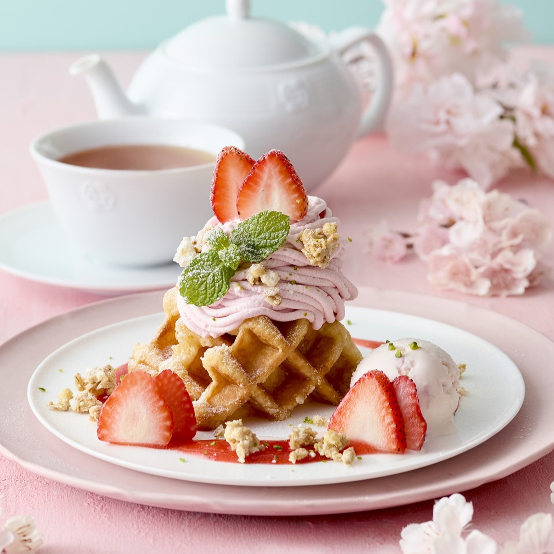 ワッフルにレモンチーズホイップを重ね、さくらホイップと苺をトッピング。ほんのりさくらが香るストロベリーソース、さくらアイス、ホワイトチョコとメレンゲのグラノーラとともに。