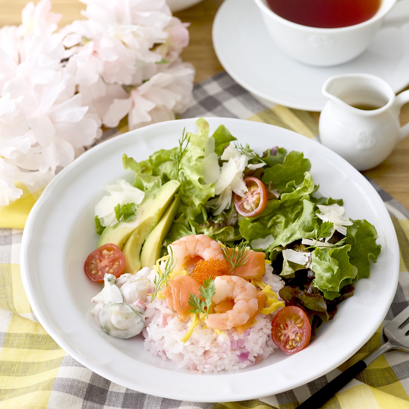 サーモン、海老、とびっこなどを甘酢しょうがとレッドオニオンのマリネを合わせたごはんにのせ、アボカド、小柱とラディッシュのサワークリームマリネをトッピング。わさび醤油ドレッシングがアクセント。