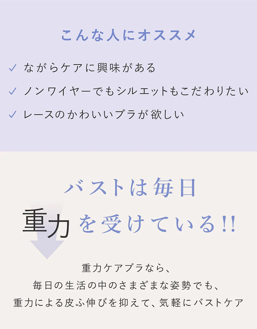※「重力ケア」「バストケア」とは、からだのサイズを測って自分に合うブラをつけて、着用中のバストを重力から守ることです