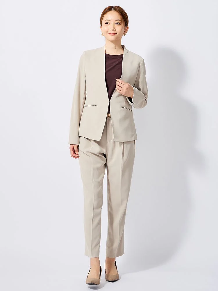 上品なノーカラーセットアップです。