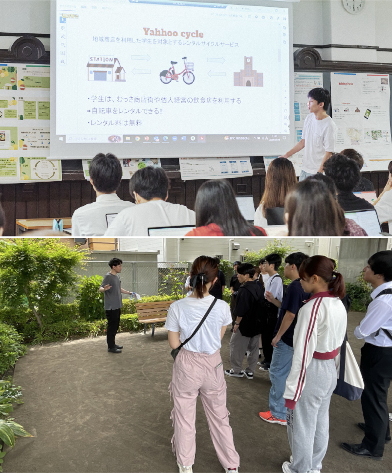 また、地域へのフィールドワークを通じて、実際にその土地に足を運び地域の特徴や現状の理解を深めました。駅社員との意見交換では、交通インフラの視点から地域の課題を捉え直す機会となり、駅という公共空間が持つ可能性についても新たな発見がありました。こうした実践的な学びを通じて、学生たちは地域の魅力を再発見し、それを活かした新たな価値づくりにも積極的に挑戦しました。