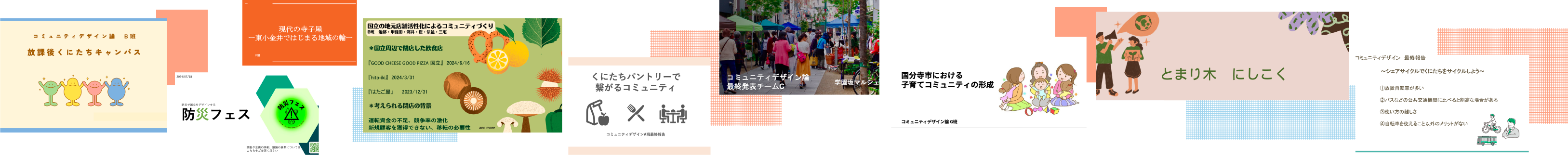 講義で学んだ「コミュニティデザイン論」をヒントに学生たちは「ここにしかないくらしづくり」というテーマで地域社会に根ざした課題に取り組みました。地域交流の促進や誰もが安心して過ごせる居場所づくりなど、日常の中で感じた地域の課題を自らの視点で捉え、それらの解決に向けた企画を提案。地域住民とのつながりを深めるイベントの提案や公共空間の活用方法の見直し、若者と高齢者が交流できる場の創出など、多岐にわたりました。