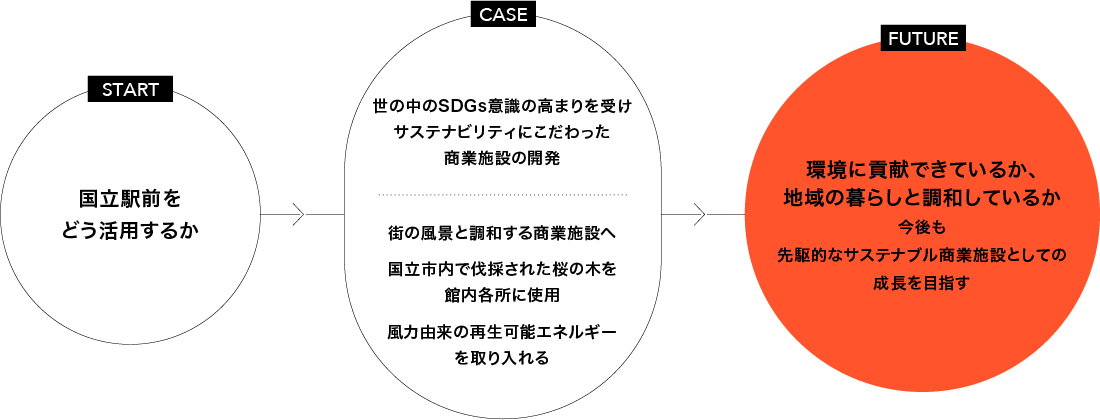 環境に貢献できているか、地域の暮らしと調和しているか。その効果や真価がわかるのは、おそらくこの先10年、20年が経ってから。国立駅の新たなシンボルとして愛され続けるよう、今後も先駆的なサステナブル商業施設としての成長を目指していきます。