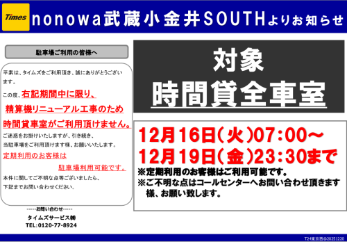 nonowa武蔵小金井提携駐車場の「タイムズJR武蔵小金井南口」は精算機リニューアル工事のため、下記日程におきまして利用不可となります。