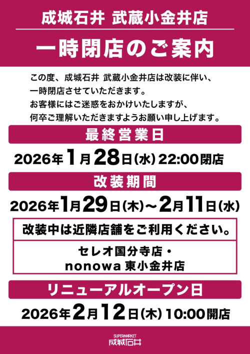 この度、nonowa武蔵小金井SOUTH 成城石井武蔵小金井店は改装のため一時休業をいたします。