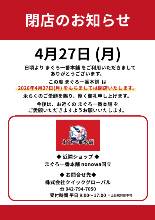 nonowa武蔵小金井 EAST「まぐろ一番本舗」は、4月27日(月)に閉店いたします。
