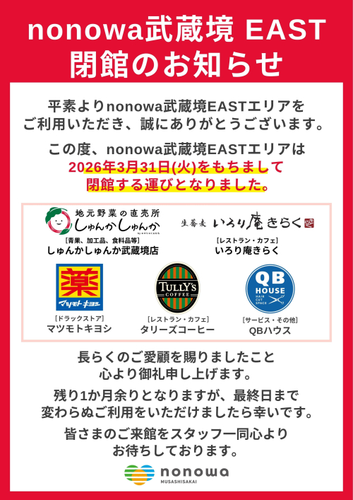 この度、nonowa武蔵境EASTエリアが3月31日をもちまして閉館することとなりました。