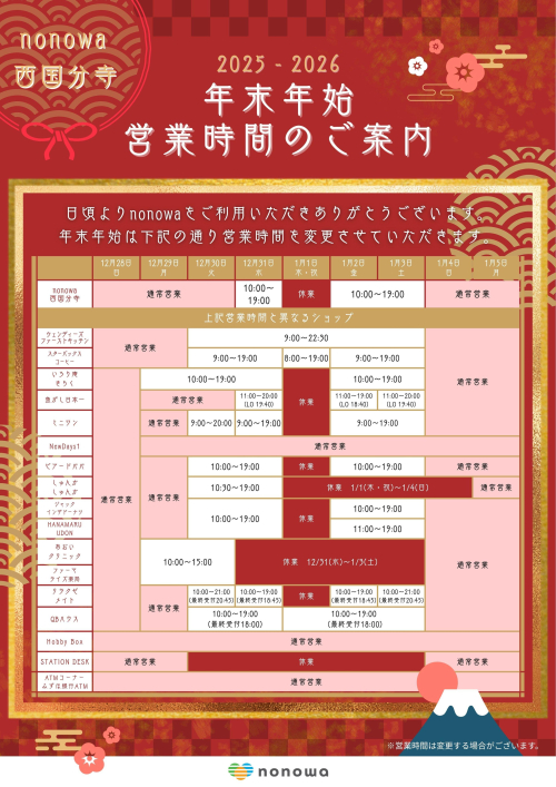 【nonowa西国分寺】年末年始の営業時間(2025年ー2026年)